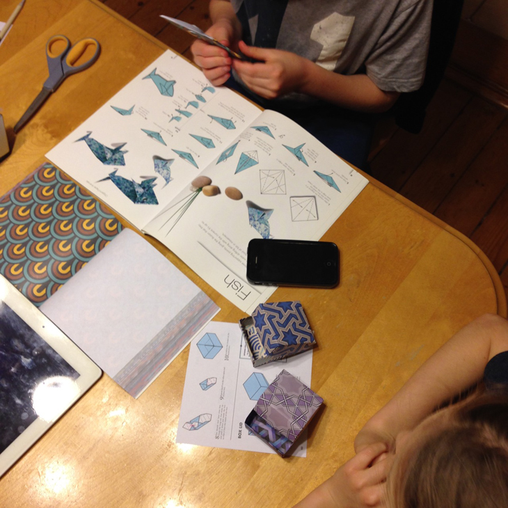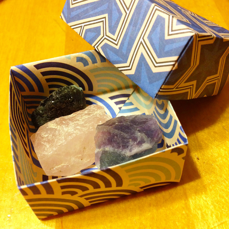 I just recently found some really cool paper for origami at our local book store so we cleared off the dining table (!) and the boys and I sat down started folding – easy stuff first – and it was fun! We made some cute little boxes and I used mine to hold some lovely raw crystals that – surprise surprise! – sit on my art table!