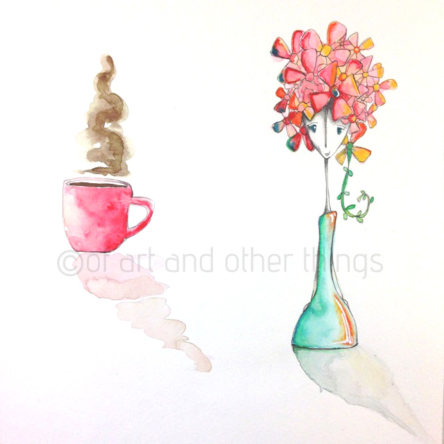 I’ve been working on a commission with a coffee theme so I have been doing some sketching and painting using different techniques. I love it when someone asks me to make art for them! Thank you thank you thank you! 🙂 I just can’t throw something together so the commissions take time as I find a drawing that really feels just right for that person. I don’t want to paint as soon as I am done drawing because I need to figure out first how I want it to look with paint: do I use watercolour, pencil and shading, acrylic, do I leave a bunch of white space or use paint to fill those areas? Eesh. I do think of these things as I am sketching as well. It’s a lot for me to think about because I want the piece to feel just right when I send it out.