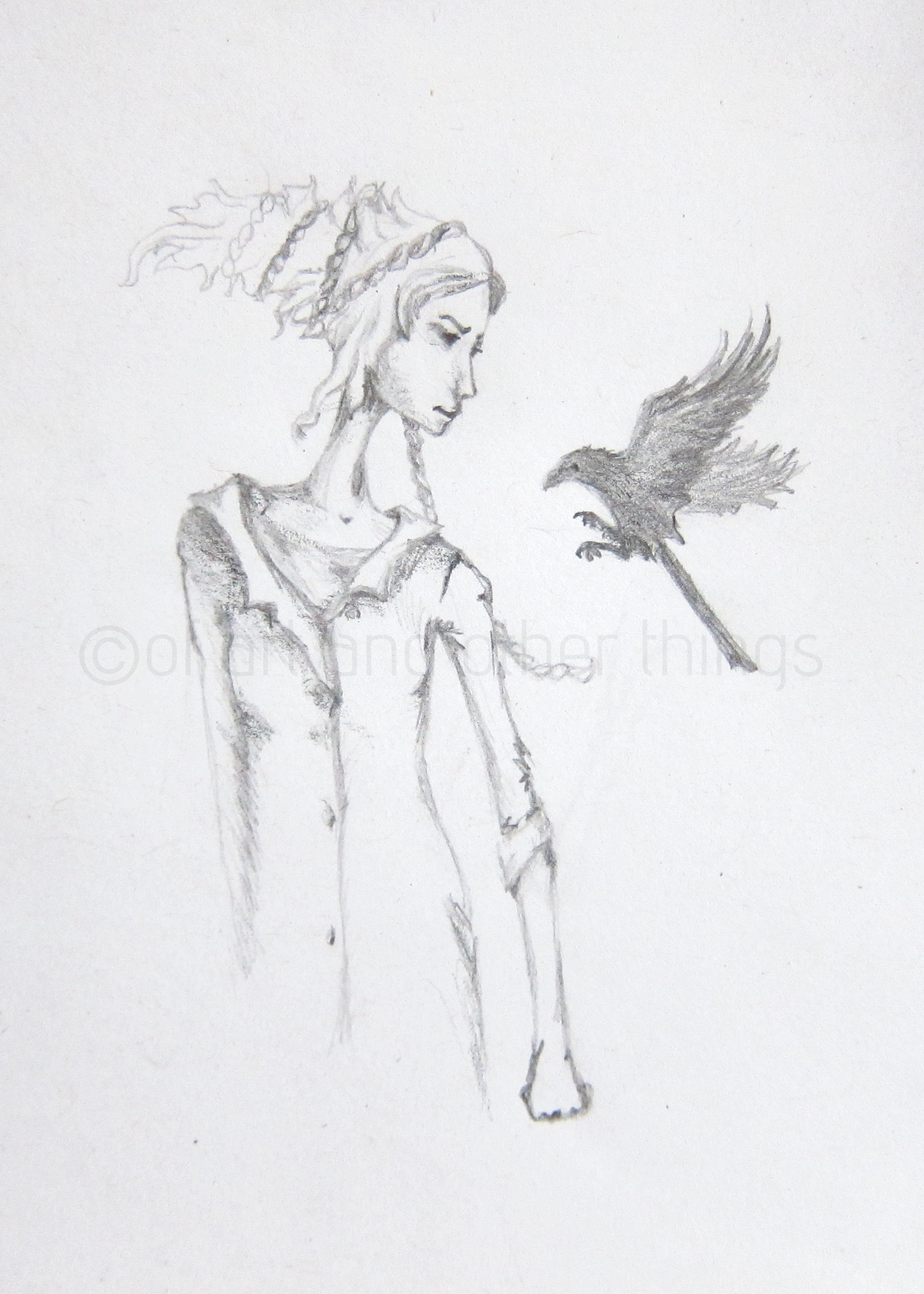 I have a friend who told me of an odd dream she had involving a girl and a crow. There is more to it than that and I’ll explain more when I have a final drawing but for now that is what I wanted to focus on. I grabbed one of my favourite childhood books, Faeries by Brian Froud and Alan Lee. I grew up reading this book and imagining the characters coming to life. Β They were so fantastic, beautiful and dangerous. From time to time I would copy out one of the character sketches when I drew, which was quite often for this shy, little introverted girl.