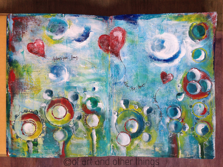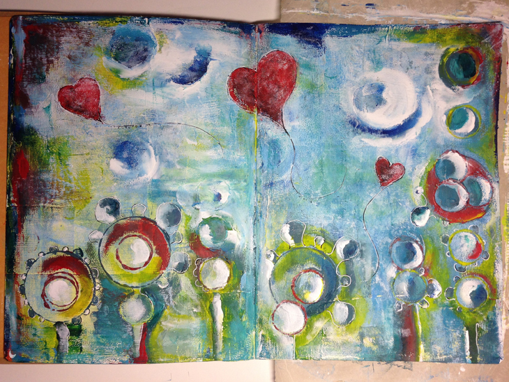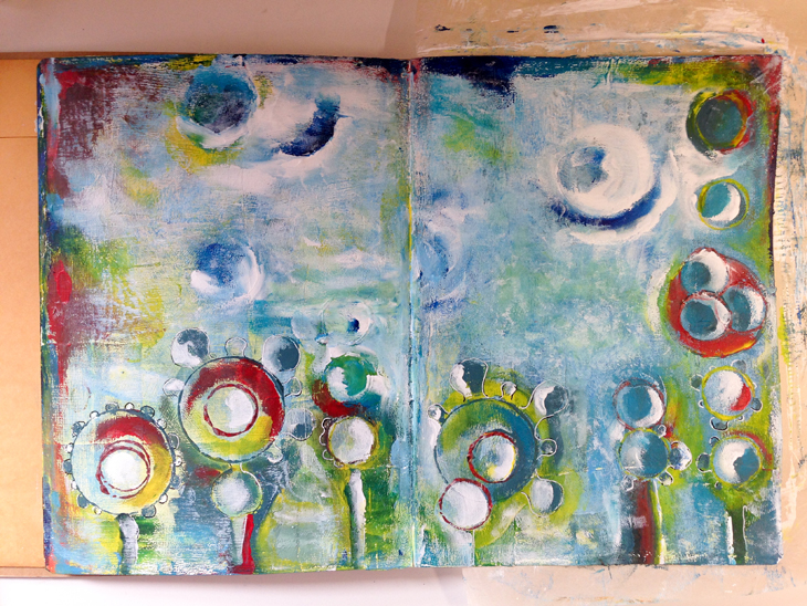 Wow! So colourful! I had a great time getting into the art journaling and for most of this spread I used my fingers to work the paint and somehow I ended up with a moon in there too! It felt so good to be such a physical part of the process.