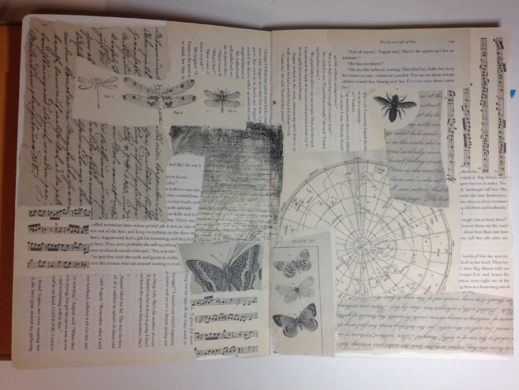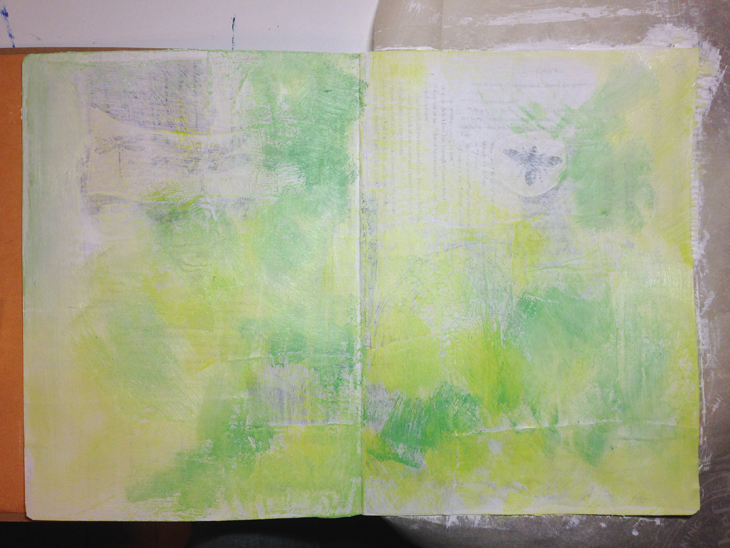 The first week’s challenge/project was to lay down paper to get rid of the frightful blank page. I really enjoyed doing this and then added a bit of paint with a dry brush and brayer.