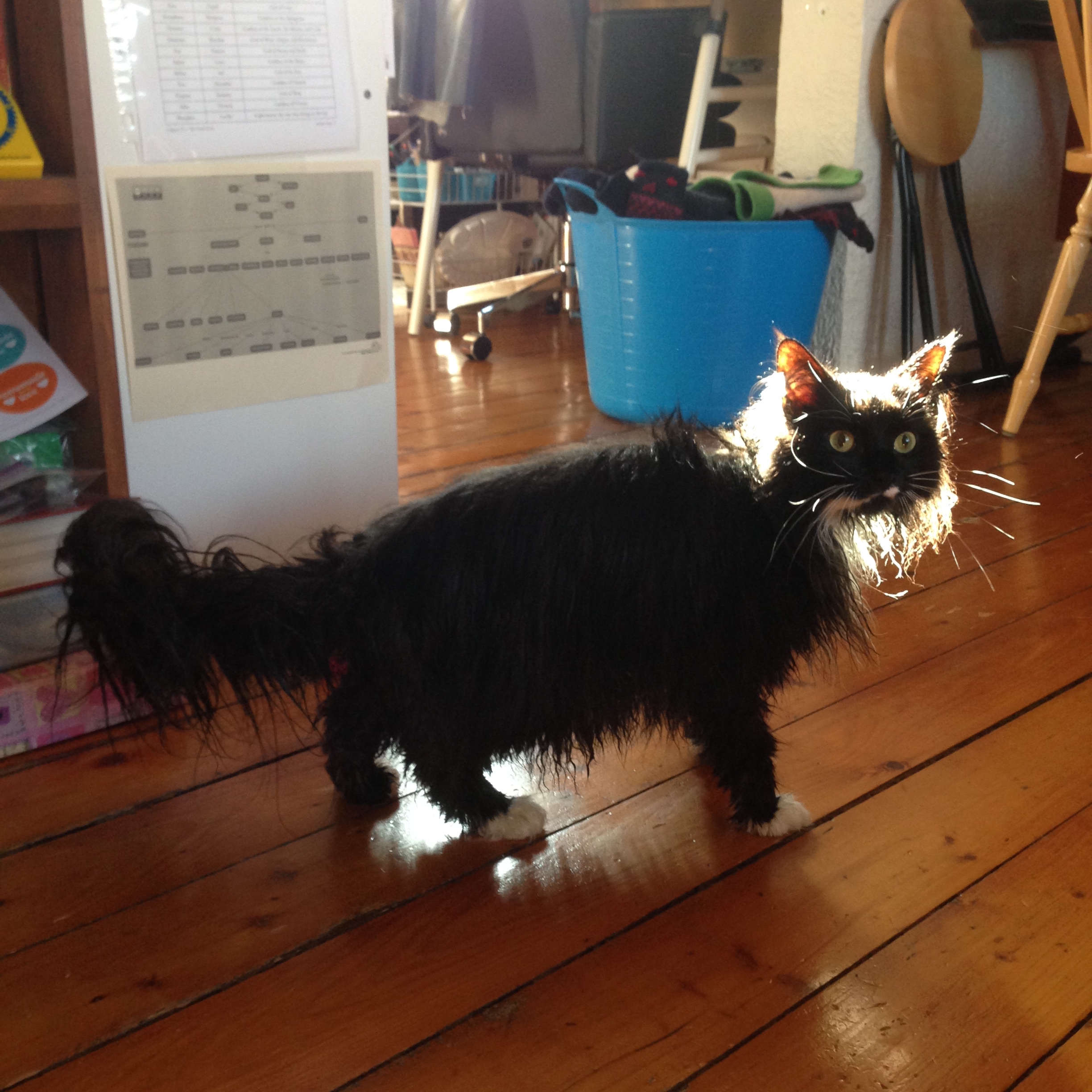 Her name is Gypsy and she is a Norwegian Forest Cat. When we took her home from the SPCA  just over a year ago we weren’t sure how long her hair really was as they had had to shave her to get out the matts. It’s pretty darn long and pretty awesome with no shedding – which is really good for me as I am generally allergic to cats. Poor kitty. She’s been a stray which is hard to believe because she is the bestest cat ever and our first so that is definitely awesome.:¬)