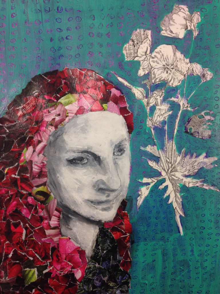 I hope you are having a great beginning to this new year! We had a lovely holiday season and I even managed to squeeze in a bit of painting too! Here is a journal piece I am working on from the online course Sketching and Collage: A Mini-Course on the Jeanne Oliver Creative Network. You have to create an account but it’s free and so very worth it. I have taken many a course and have loved every single one of them. Within this one I’ve learned how to do an image transfer, paint a face with charcoal and gesso and a few other handy techniques. I love learning new ways to create so I am always open to taking a class here and there. This one has definitely been worth it!!